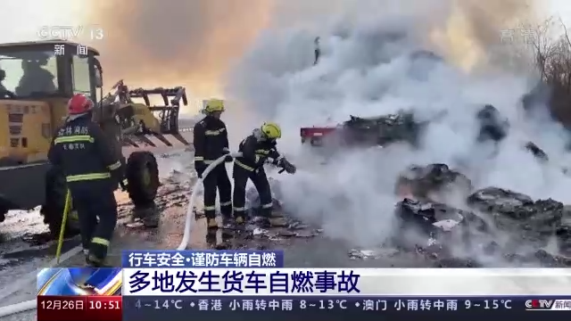 四平市消防救援支隊 馮竟哲:貨車長時間、長距離行駛,導(dǎo)致線路、油路損耗加劇,線路漏電短路起火,油管線路老化破損,滲漏出的燃油一旦碰到發(fā)動機(jī)艙內(nèi)的高溫部件,極易產(chǎn)生明火引發(fā)車輛自燃。